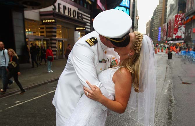 Newlyweds kiss in Times Square at the WEtv and The USO's "Operation I Do" event at Military Island, Times Square on June 11, 2009 in New York City.